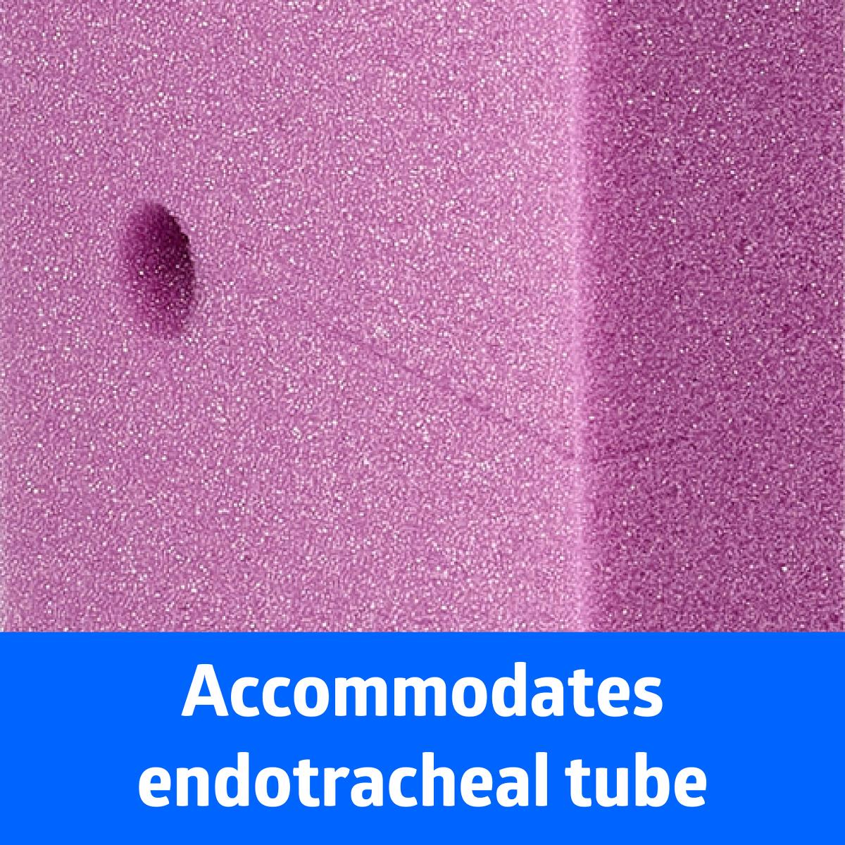 Posicionador de espuma de un solo uso que permite acomodar el tubo endotraqueal en cualquier lado del dispositivo garantizando su posicionamiento adecuado.